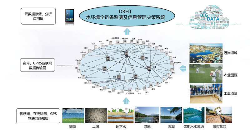 集物聯網、互聯網、大數據、云計算、移動終端于一體,通過安全開放的數據平臺,綜合降雨、土壤、地下水、河流、湖泊、飲用水水源地、城市管網、工業點源、農業面源、近岸海域水環境全鏈條監測數據,建立環境管理的基礎數據與可視化模型,達成全方位監控、深度科學分析、應急預警、決策支持、防控治一體化,為“河長”提供強有力的技術支撐,為全民水環境安全保駕護航。